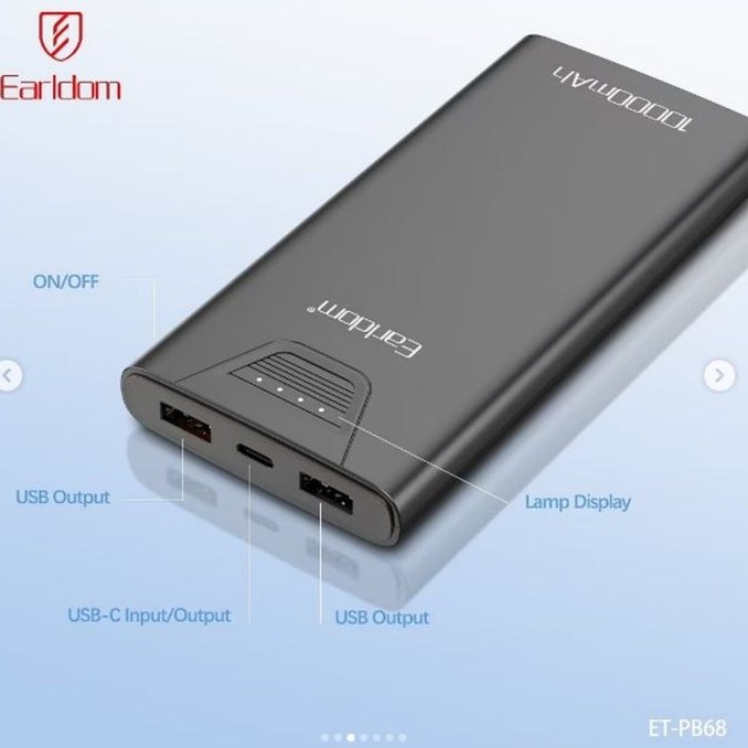 قابلیت حمل و تجربه کاربری نمایشگر وضعیت شارژ پاوربانک Earldom PB68 معمولاً مجهز به یک نشانگر LED کوچک یا در مدلهای کمی پیشرفتهتر، یک نمایشگر دیجیتال کوچک است. نشانگر LED: اغلب شامل ۴ چراغ کوچک است که هر چراغ نماینده ۲۵ درصد از شارژ باقیمانده است. (مثلاً یک چراغ روشن = ۰ تا ۲۵٪ شارژ باقی مانده).